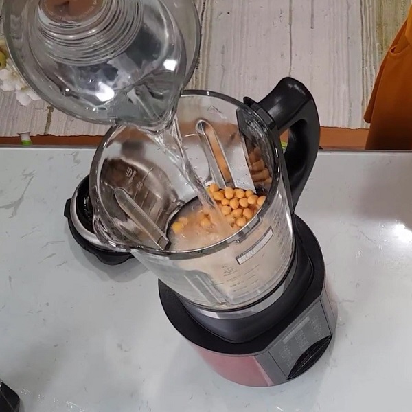 Bước 3: Xay nhuyễn đậu gà organic đã nấu với nước. Lưu ý không đổ hết nước vào xay cùng đậu gà organic mà đổ từ từ cho đến khi hết 1,5l nước.