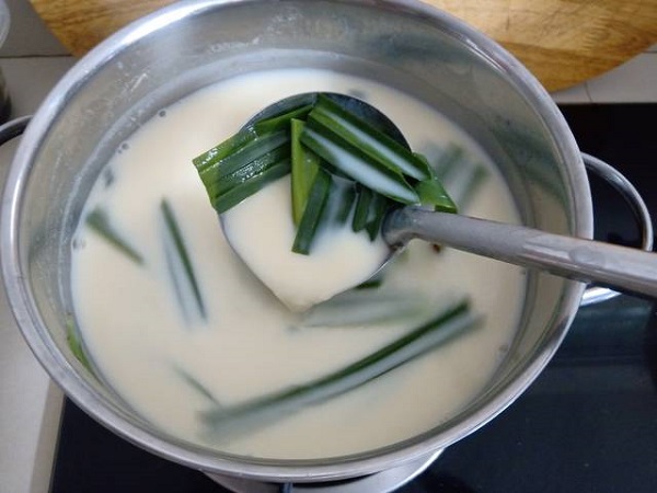 Lọc bã đậu gà organic lấy nước. Sau đó cho vào nồi cùng khúc lá dứa buộc lại để đun. Sữa sôi hạ lửa nhỏ vừa đun liu riu. Cho thêm 300ml sữa đã chuẩn bị vào vào, đun thêm 5 phút rồi tắt bếp.