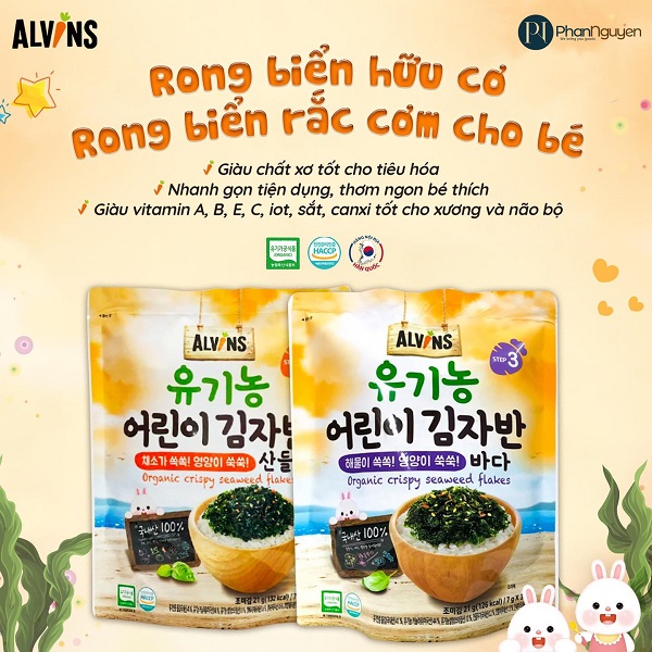 Các sản phẩm mang thương hiệu Alvins được làm từ nguyên liệu tươi ngon, quy trình chế biến đạt chuẩn hữu cơ USDA Mỹ, KOS Hàn Quốc, chuẩn an toàn vệ sinh HACCP Hàn Quốc. Các sản phẩm của Alvins rất được ba mẹ tin tưởng lựa chọn với danh mục sản phẩm bán chạy như: Rong biển hữu cơ, Gia vị rắc cơm cho bé, sữa chua khô sấy lạnh, bánh gạo ăn dặm,….