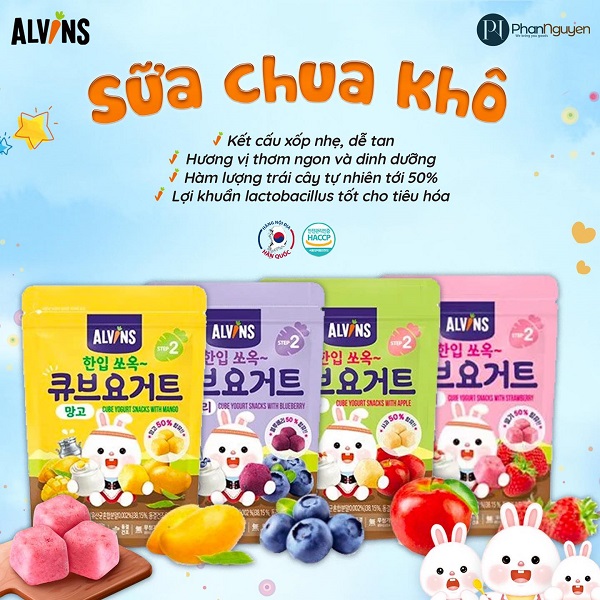 - Sữa chua khô sấy lạnh: vị xoài, vị việt quất, vị dâu, vị táo