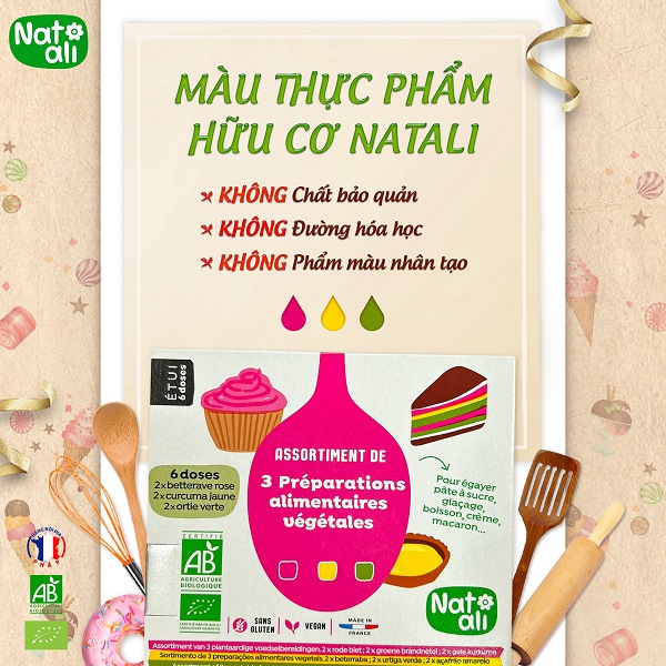 Tham khảo sản phẩm màu thực phẩm hữu cơ Natali tại link: https://pncom.vn/mau-thuc-pham-huu-co-hong-vang-xanh-la-natali-6x5g