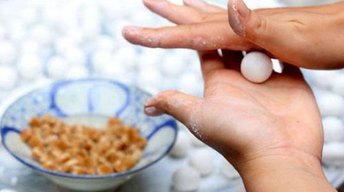 Bạn chia khối bột ra làm nhiều phần nhỏ theo bằng nhau (khoảng 10gram), rồi ấn dẹt từng khối bột, đặt nhân đường vào giữa rồi miết kín lại, vo tròn. Thành quả sẽ có kích thước tương tự như phần bánh mà bạn đã nặn, vì thế đừng nặn nhỏ quá nhé, vì khi nấu chín đường có thể chảy ra và làm hỏng vỏ bánh. Nhưng cũng đừng nặn to quá vỏ bánh dày cũng khiến bánh mất vị ngon và nhanh ngấy.