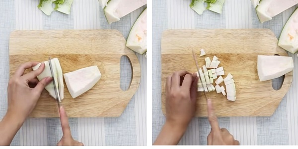 Bổ múi cau để tách vỏ bưởi. Lấy đầu dao nhọn lóc phần xơ bưởi bên trong bỏ đi. Sau đó, cắt cùi bưởi bằng đốt ngón tay. Không nên cắt bé quá khi sơ chế cùi bưởi sẽ bị nát. Cũng không nên to quá khi ăn không ngon và nhân bên trong sẽ không được giòn.
