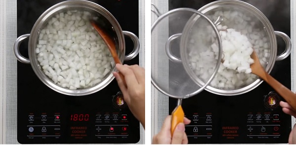 Đun sôi nồi nước rồi cho chỗ cùi bưởi đã áo bột năng vào đu với lửa nhỏ trong 3-5 phút, khi thấy cùi bưởi trong lại thì vớt ra cho ngay vào tô nước đá để cùi bưởi được giòn.
