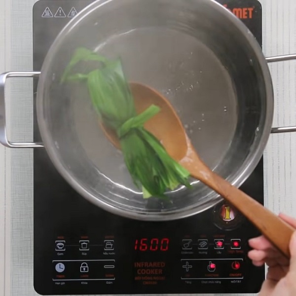 Đun sôi khoảng 2 lít nước, sau khi nước sôi, cho lá dứa (lá nếp) vào luộc khoảng 2 - 3 phút để lấy mùi thơm rồi vớt ra. Bước này bạn có thể làm hoặc bỏ qua.