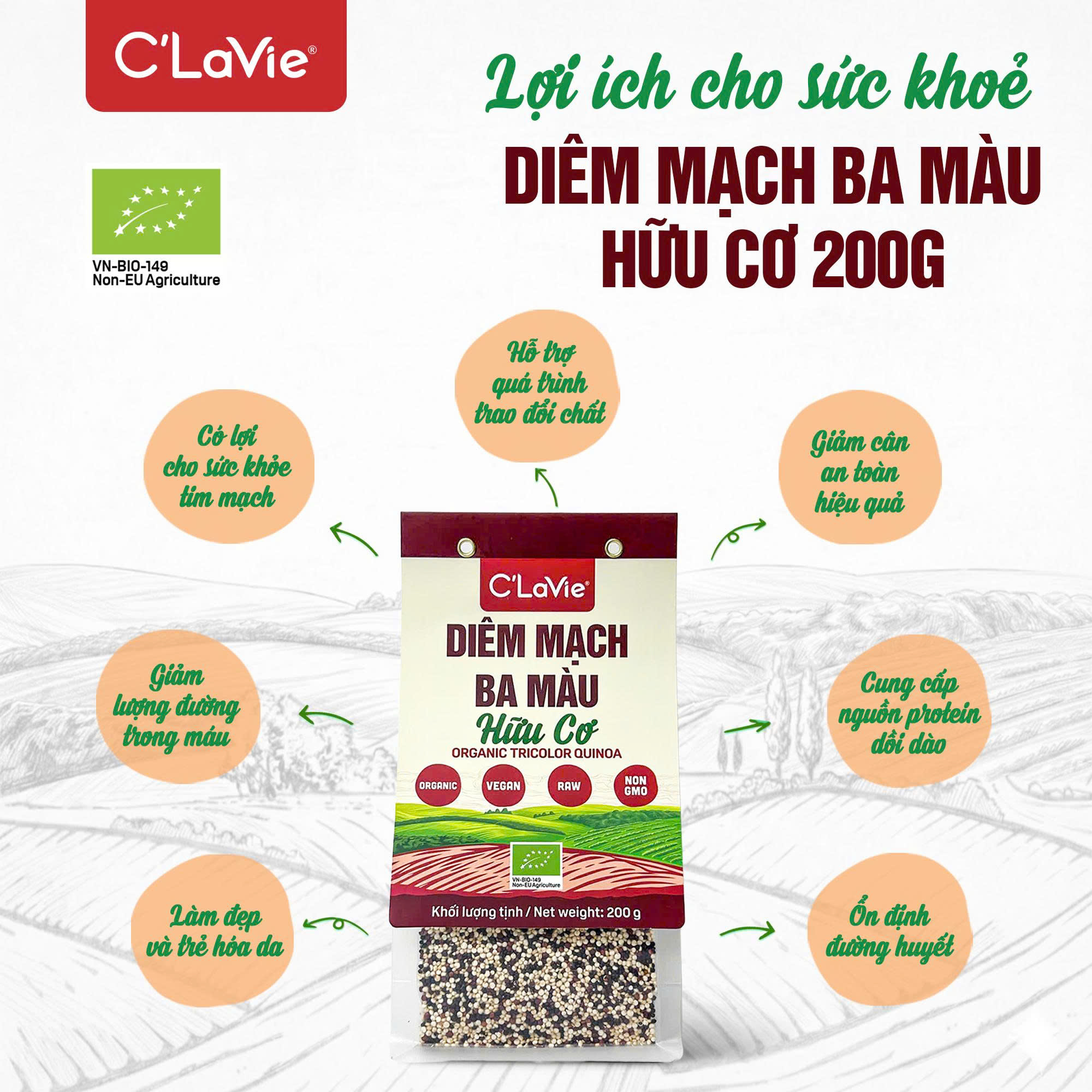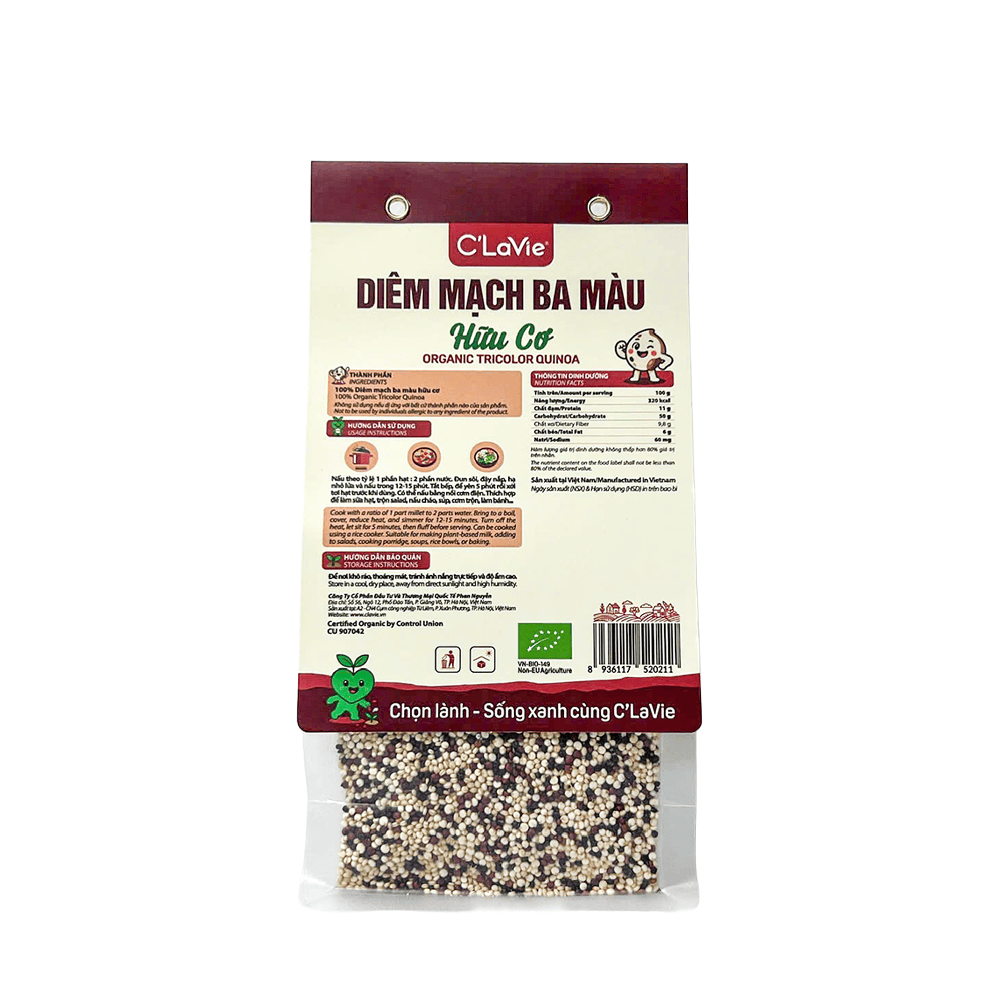 Hướng dẫn sử dụng: Nấu tỷ lệ 1 phần hạt : 2 phần nước. Đun sôi, đậy nắp và hạ nhỏ lửa nấu trong 12 -15 phút. Tắt bếp để ủ 5 phút rồi xới tơi hạt trước khi dùng, Có thể nấu bằng nồi cơm điện. Thích hợp để làm sữa hạt, trộn salad, nấu cháo, làm soup, làm bánh...