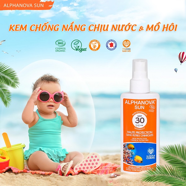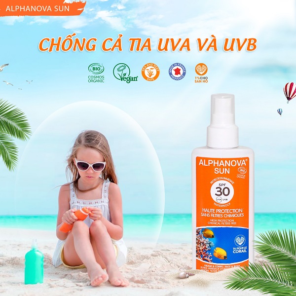 - Kem chống nắng hữu cơ trẻ em SPF30 dạng xịt Alphanova Sun 125g: phù hợp cho bé trên 3 tuổi