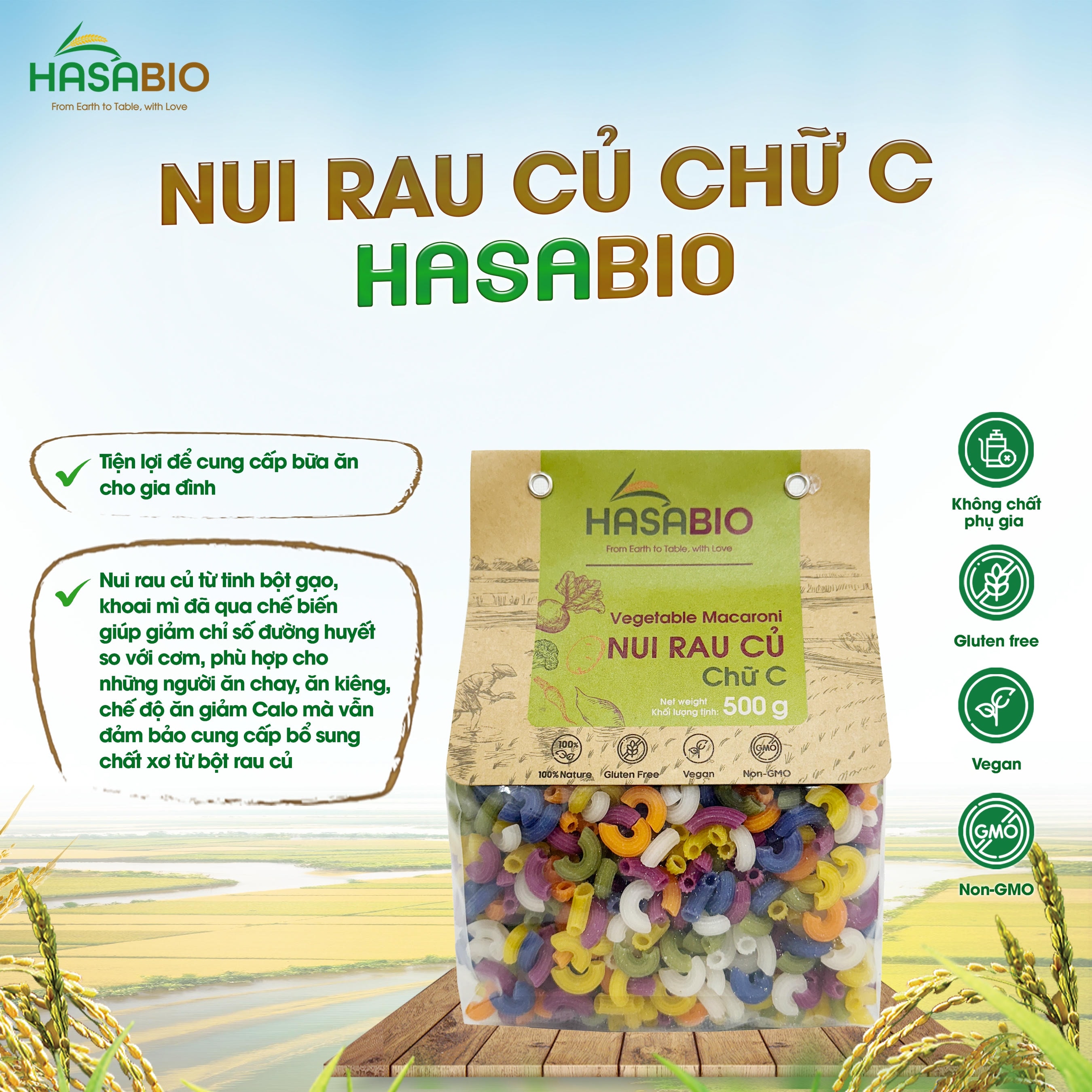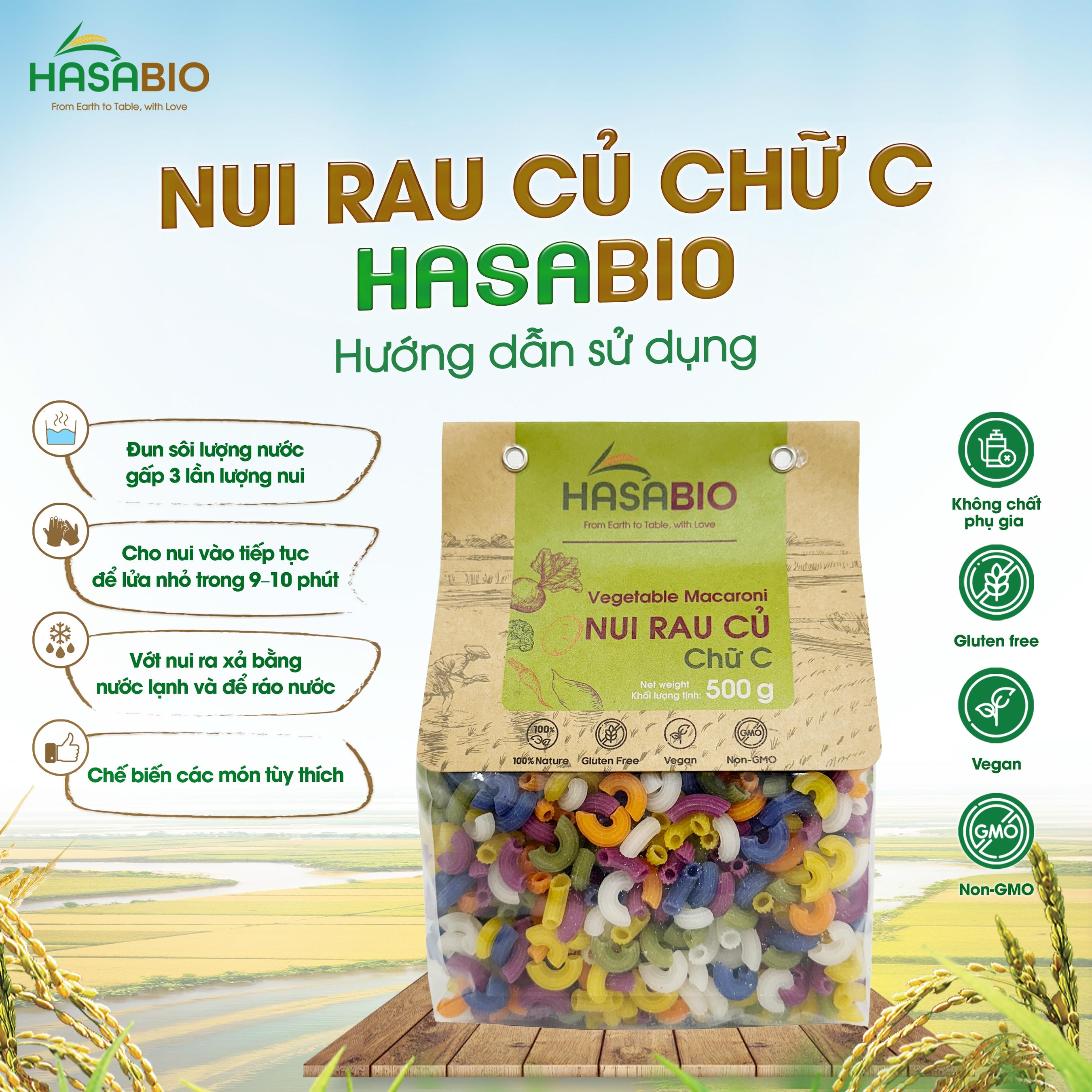 Hướng dẫn sử dụng: Tiện lợi để cung cấp bữa ăn cho gia đình; Tinh bột gạo, khoai mì đã qua chế biến giúp giảm chỉ số đường huyết so với cơm. Do đó, nui rau củ phù hợp cho những những người ăn chay, ăn kiêng, chế độ ăn giảm Calo mà vẫn đảm bảo cung cấp bổ sung chất xơ từ bột rau củ.