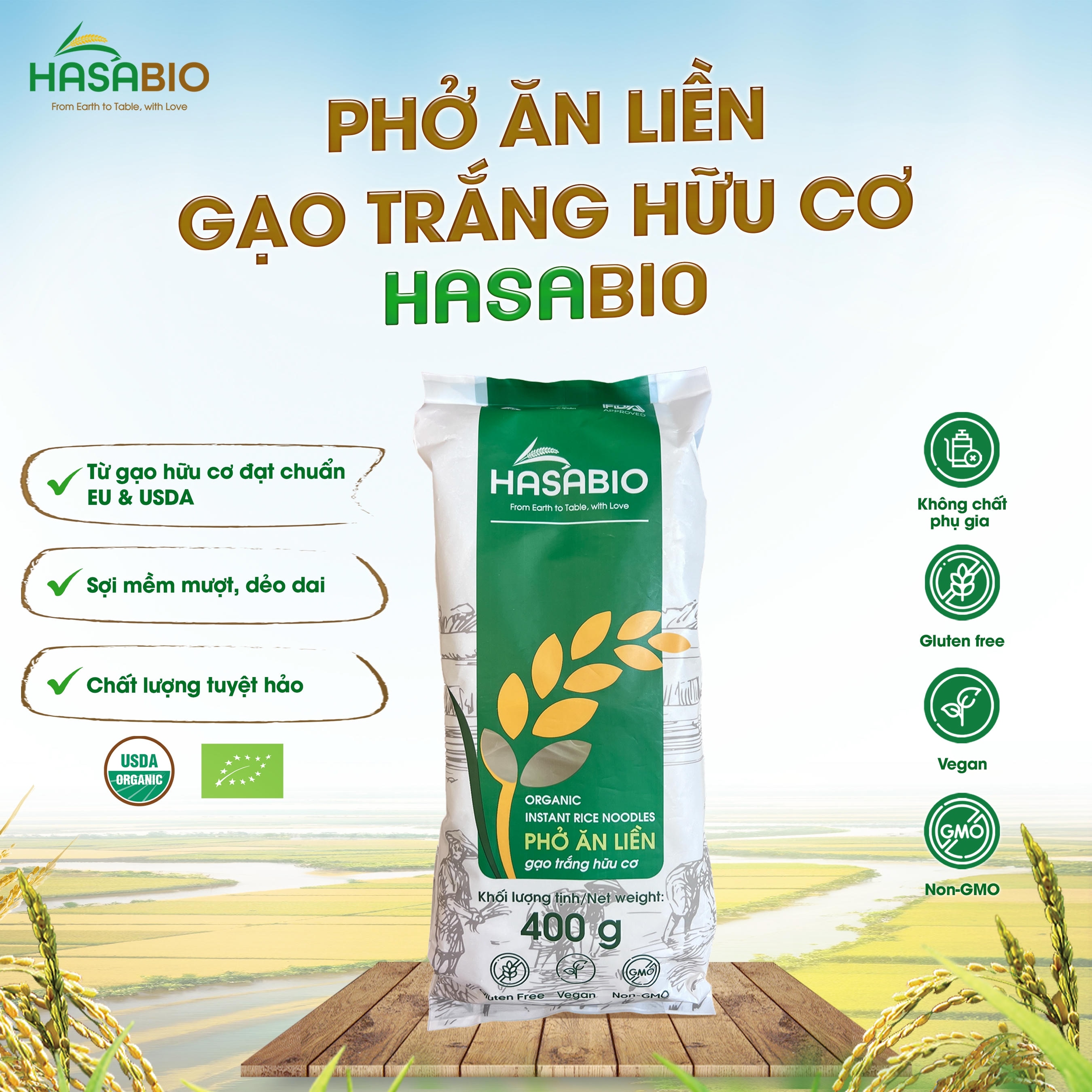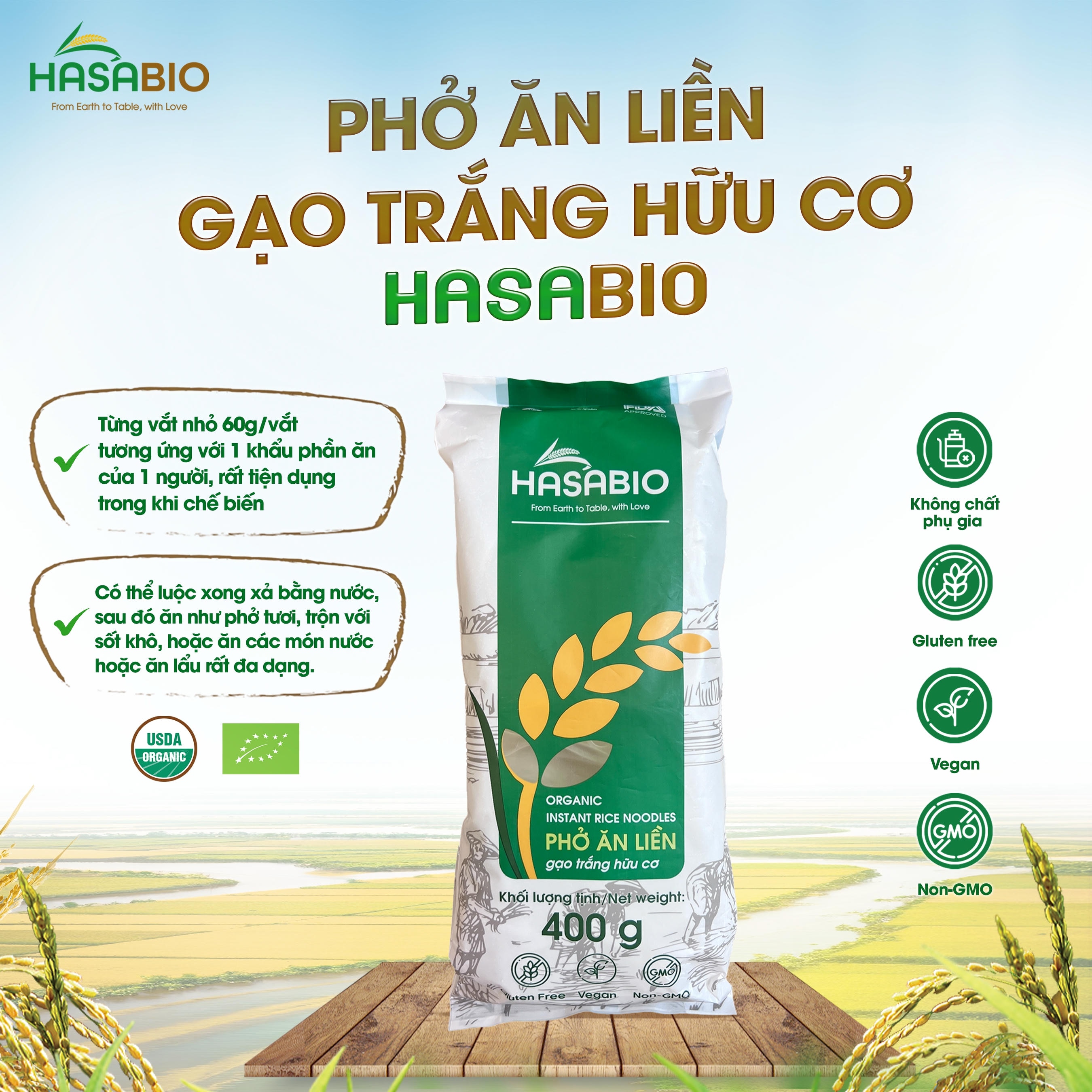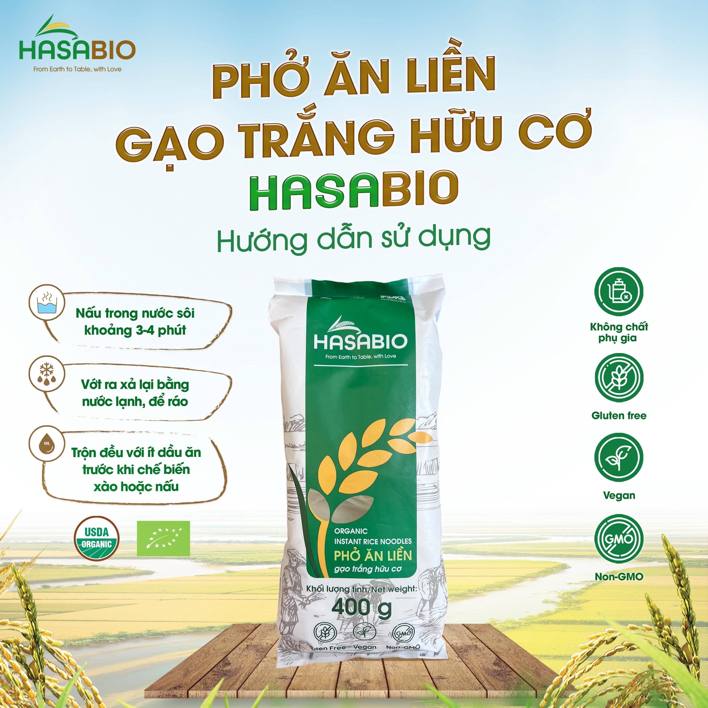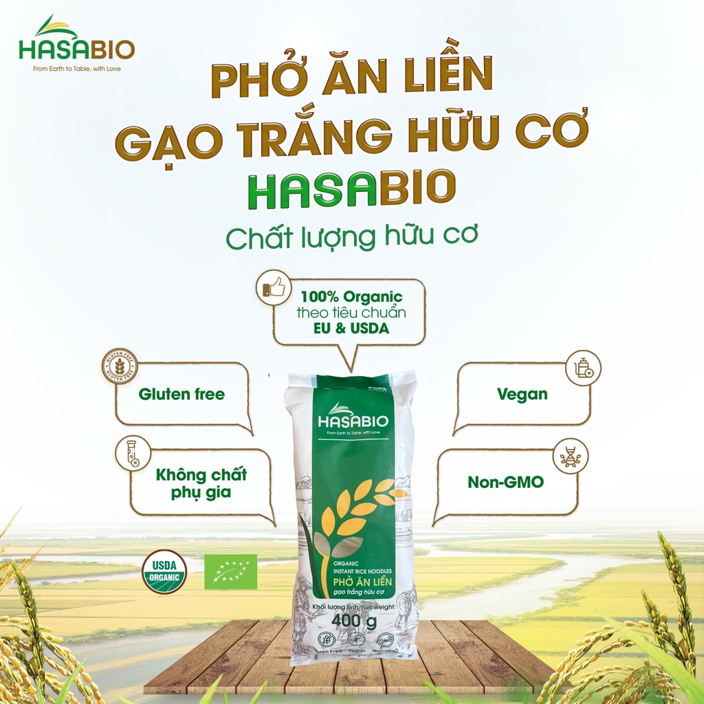 Thành phần: Gạo hữu cơ 93%, tinh bột khoai mì hữu cơ 6%, muối 1%