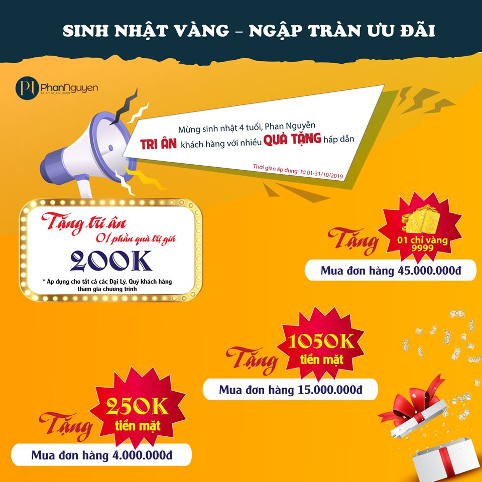 Trong không khí vui mừng khi nhìn lại chặng đường phát triển 4 năm qua, Phan Nguyễn muốn gửi tới Quý khách hàng lời TRI ÂN sâu sắc nhất bằng một HÀNH ĐỘNG cụ thể nhất đó là chương trình khuyến mại “ SINH NHẬT VÀNG- NGẬP TRÀN ƯU ĐÃI”, cụ thể như sau:
