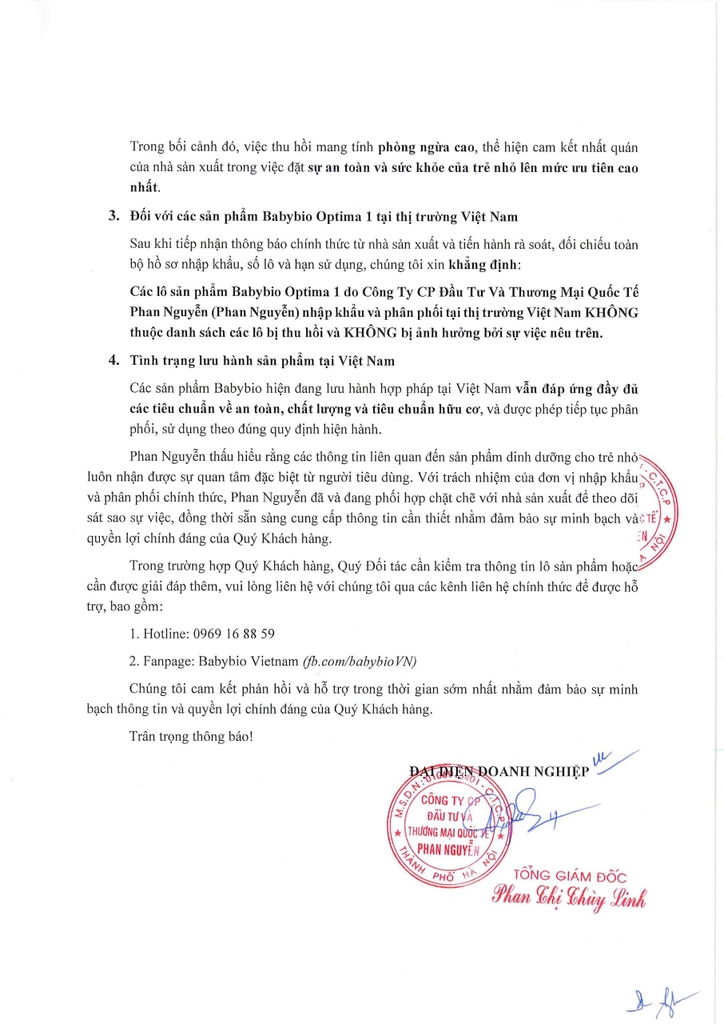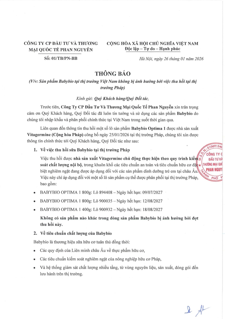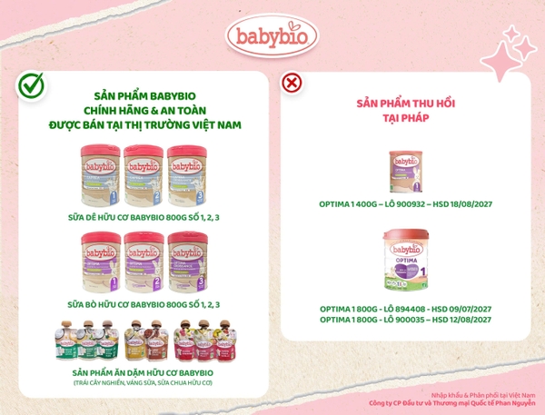Theo đó, Các lô sản phẩm BABYBIO OPTIMA 1 do Công ty CP Đầu Tư và Thương Mại Quốc Tế Phan Nguyễn nhập khẩu và phân phối tại thị trường Việt Nam KHÔNG thuộc danh sách các lô bị thu hồi và KHÔNG bị ảnh hưởng bởi sự việc nêu trên.